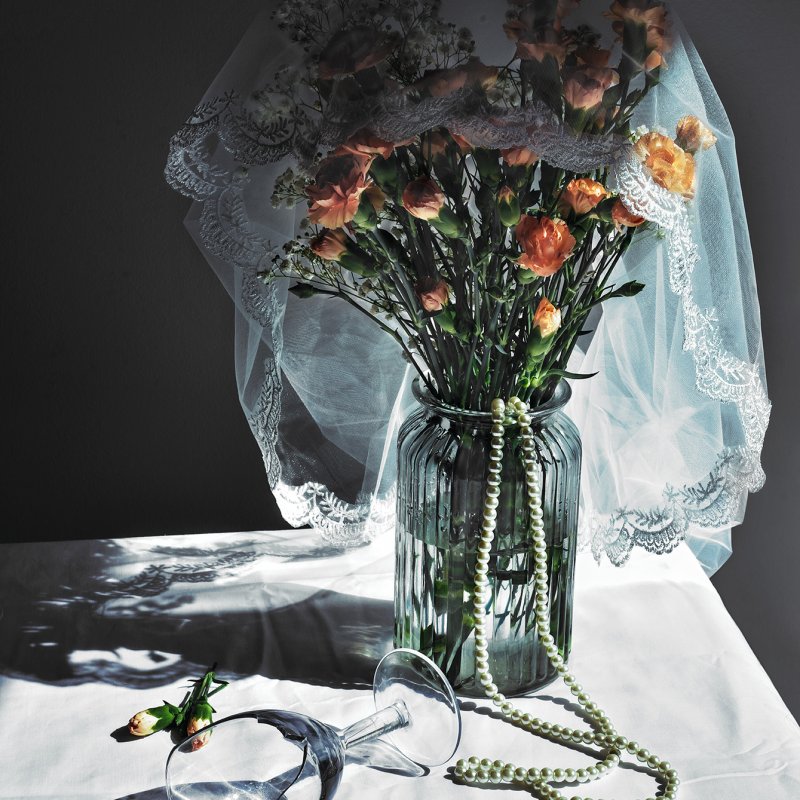 Look closer; mess and decay is revealed. Wine spilled on a perfect white cloth. A broken glass. An abandoned wedding veil. A pearl necklace. A pile of red mulch. Dying flowers.